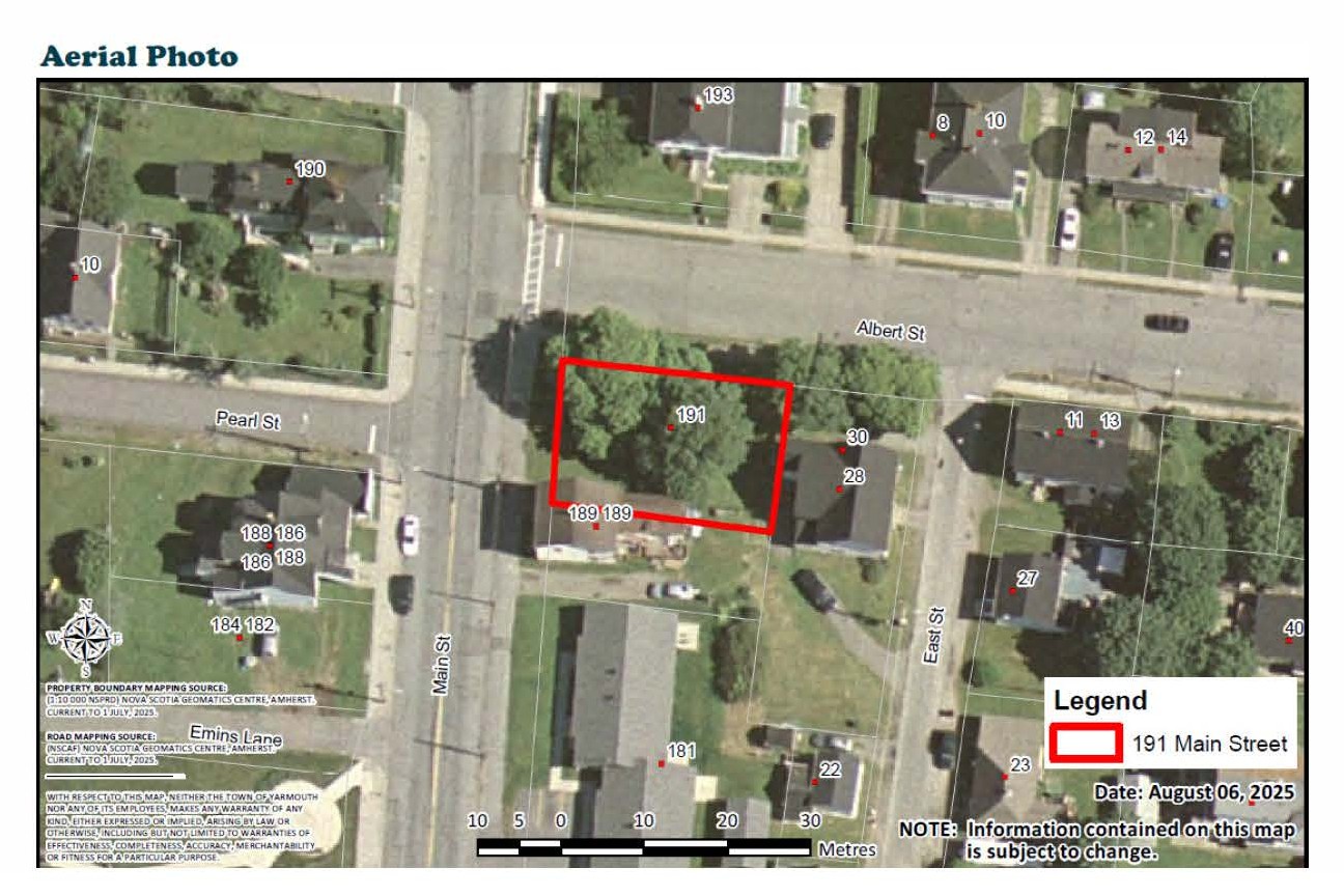 The Town of Yarmouth has received a planning application from the owner to rezone their property located at 191 Main Street (PID# 90197666) from Medium Density Residential – Main Street (R-2M) Zone to Downtown Commercial (C-1) Zone. Subject to Council approval of this application, the subject property would qualify for the Town of Yarmouth Tax Phase-In Program, currently available only within the Central Business District (Downtown).