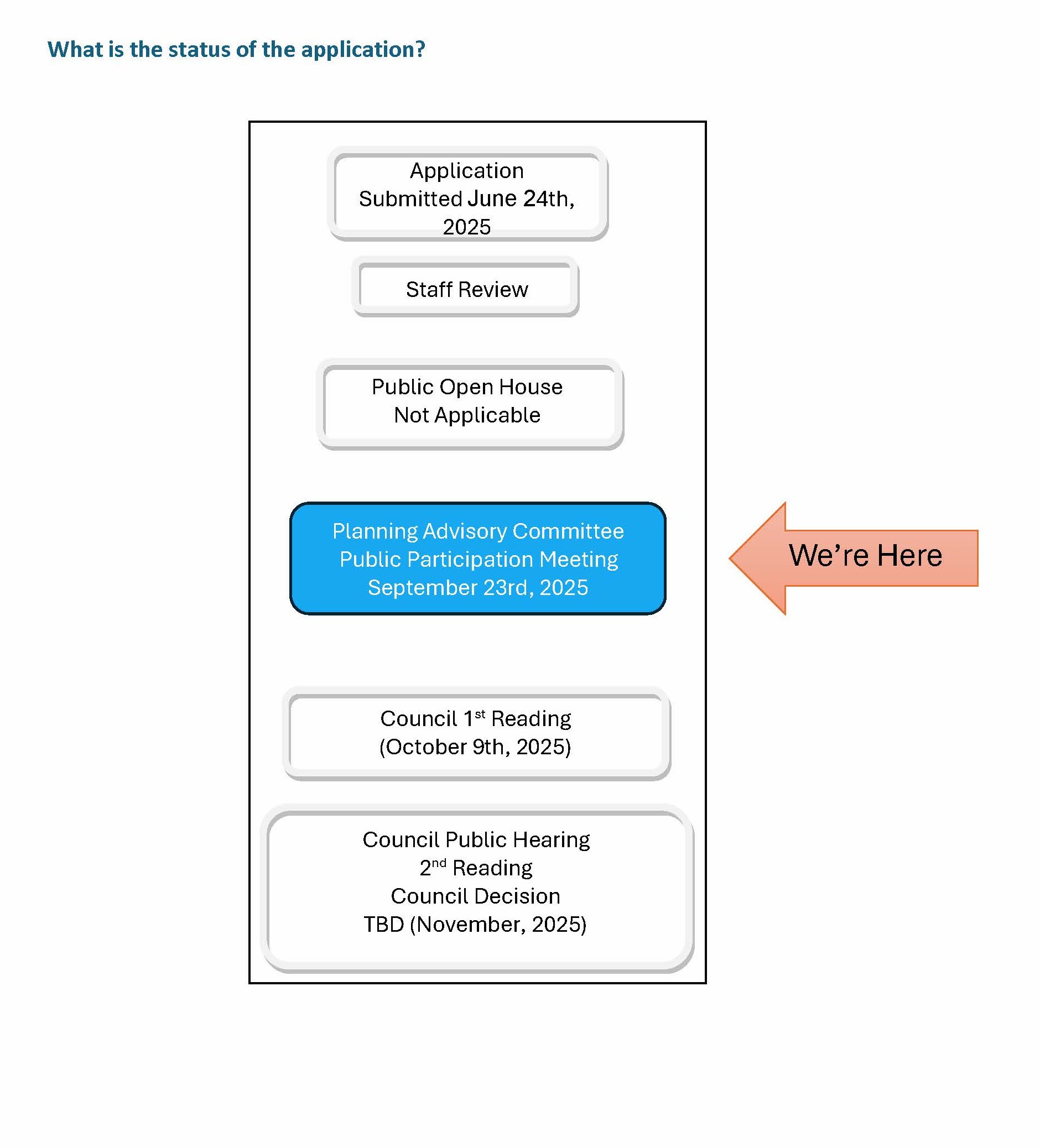 A Public Participation Meeting has been scheduled for TUESDAY, SEPTEMBER 23rd, 2025 AT 6PM at the Town Hall (400 Main St). The meeting allows interested parties to provide their thoughts on the submitted application directly to the Planning Advisory Committee. All members of the public are welcome to attend.