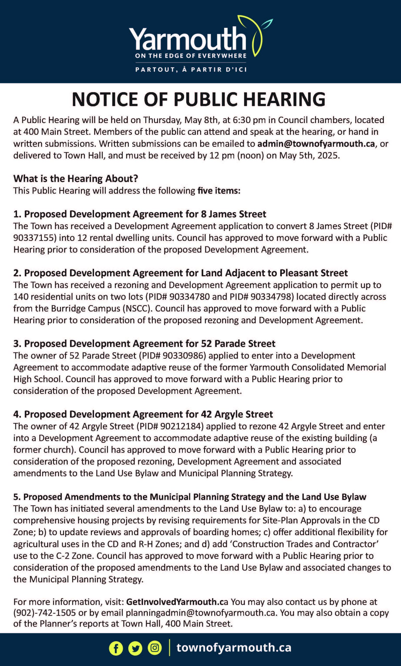 A Public Hearing will be held on Thursday, May 8th, at 6:30 pm in Council Chambers at Town Hall, located at 400 Main Street. Members of the public can attend and speak at the hearing, or hand in written submissions. Written submissions can be emailed to admin@townofyarmouth.ca, or delivered to Town Hall, and must be received by 12pm (noon) on May 5th, 2025.