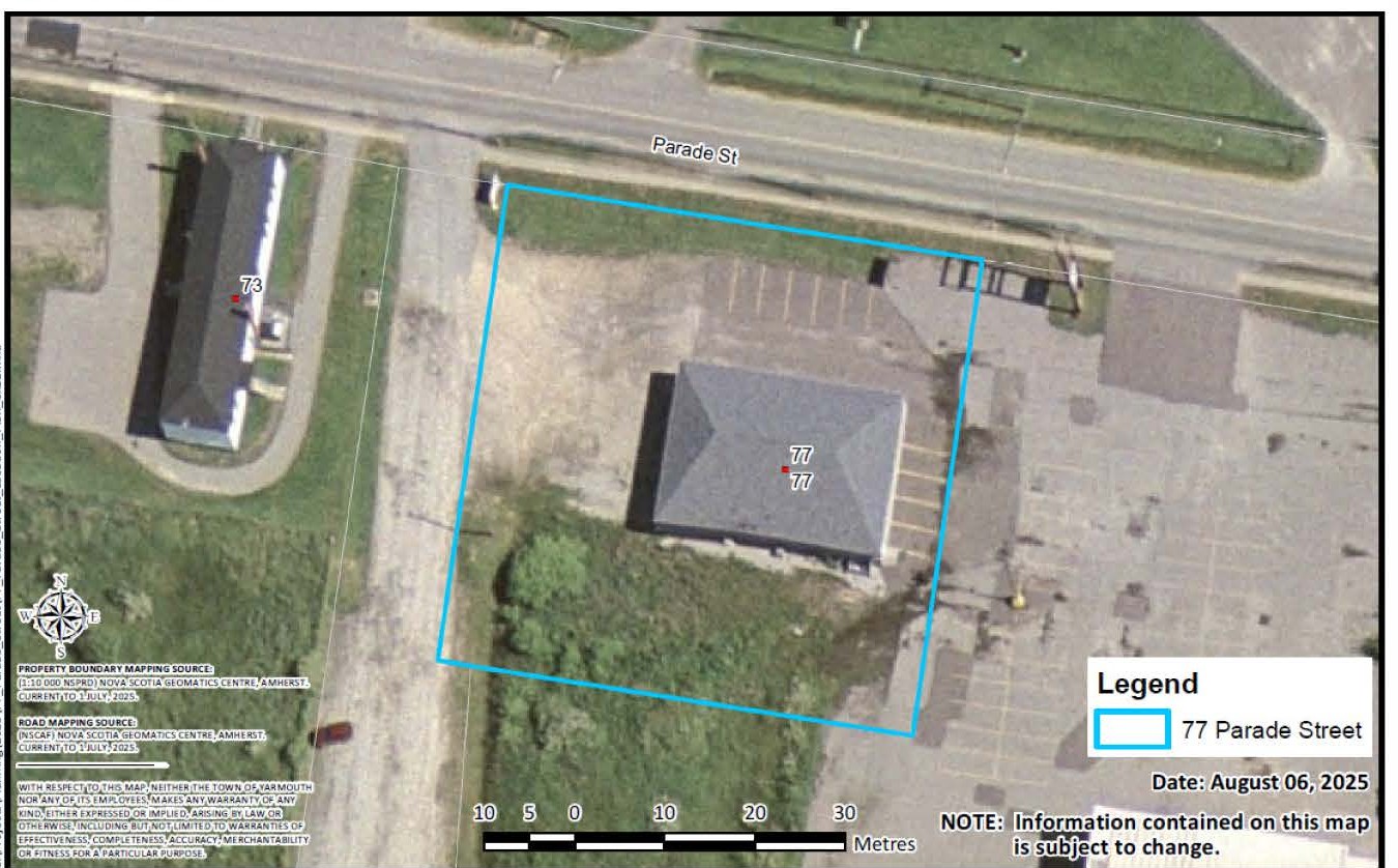 The Town of Yarmouth has received a planning application from the owner to enter into a Development Agreement permit medical clinic uses (up to 4,000sf in size) within the existing building located at 77 Parade Street (PID# 90304296).