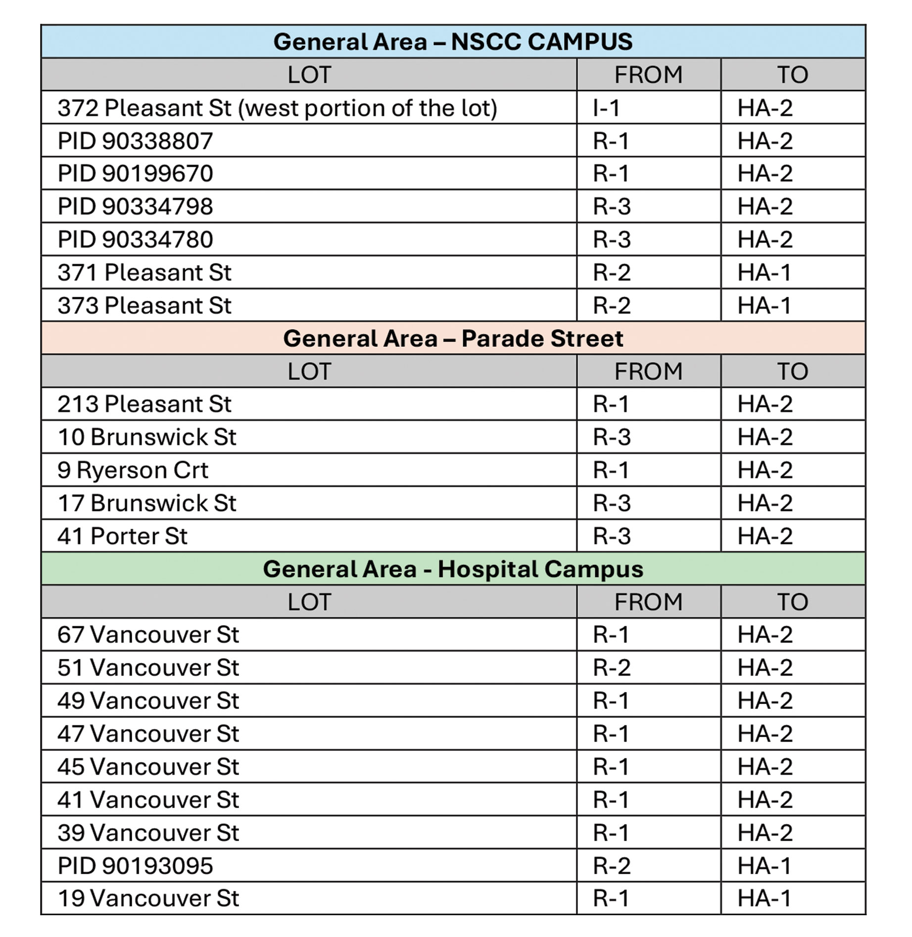 The proposed Land Use Bylaw amendments also include a set of rezonings of lots in proximity to several key Town institutions such the Yarmouth Hospital and the Nova Scotia Community College. For a complete list of properties to be “upzoned” see the table below.