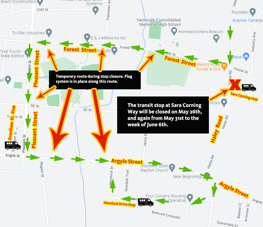 The bus will not travel on Haley Road between Forest Street and Argyle Street during these closures. The nearest stops at Havelock Drive and Grantham Street will remain open, and the flag system will be in effect along the temporary route on Forest Street/Pleasant Street/Argyle Street (please see map below).
