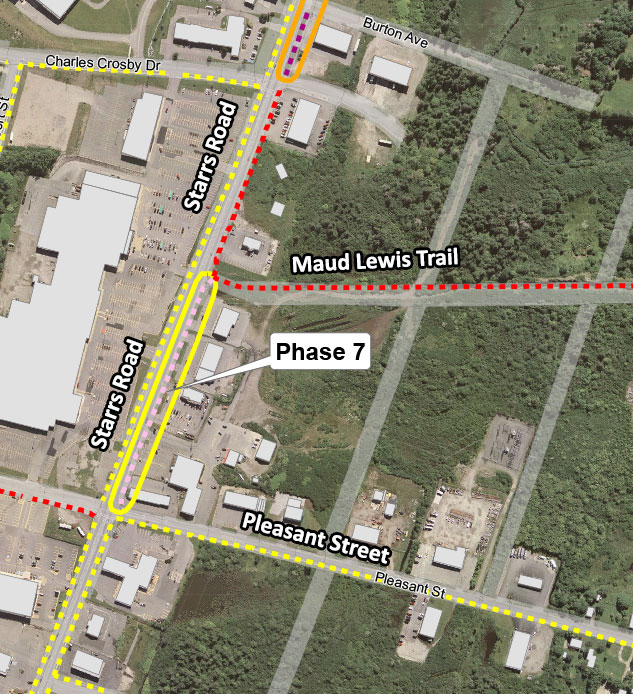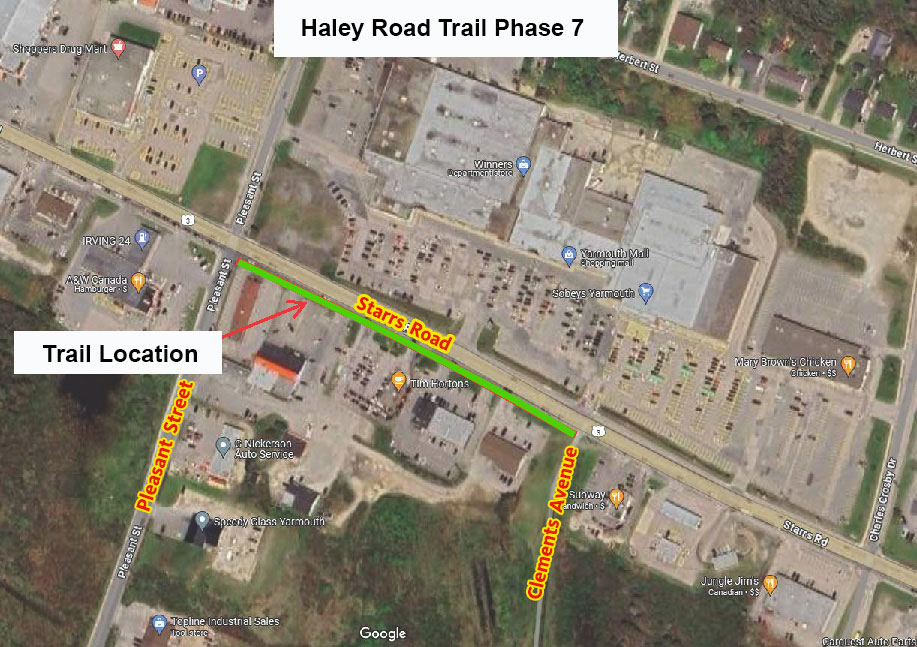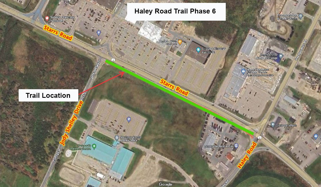 Completed Fall of 2021. Asphalt trail between Starrs Road and Parade Street on Haley Road. This adds a northward extension to the Phase 1 multi-use trail. A four-way stop and a 6 inch curb will be added at the Parade Street/Haley Road intersection. A sidewalk extension will also be added on the north side of Starrs Road connecting existing sidewalk to the intersection.