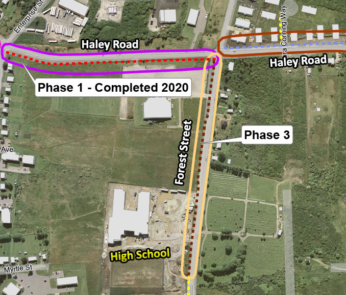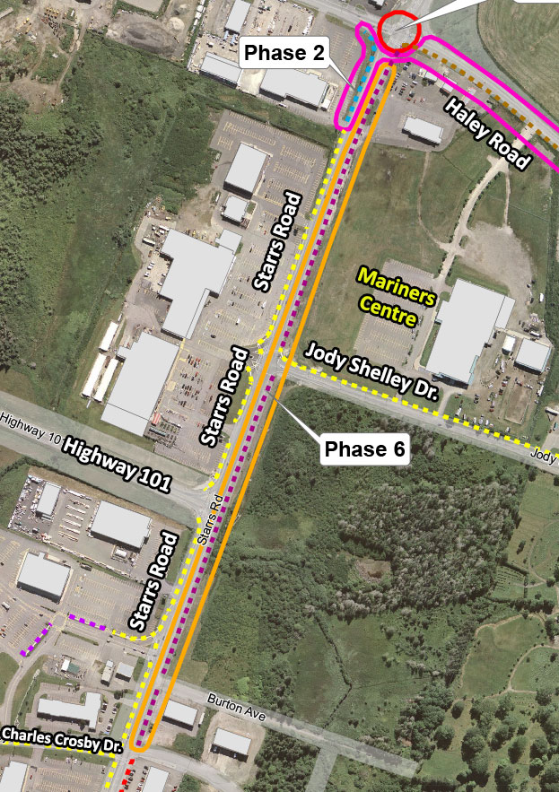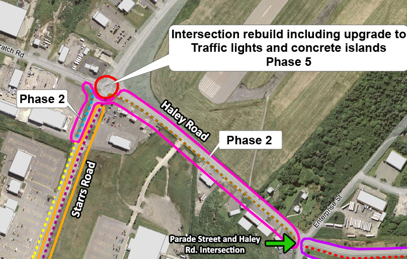 Completed. This phase involved a rebuild of the intersection at Haley Road and Starrs Road, including upgraded traffic lights and concrete islands. This section was completed in the fall of 2022/fall of 2023.