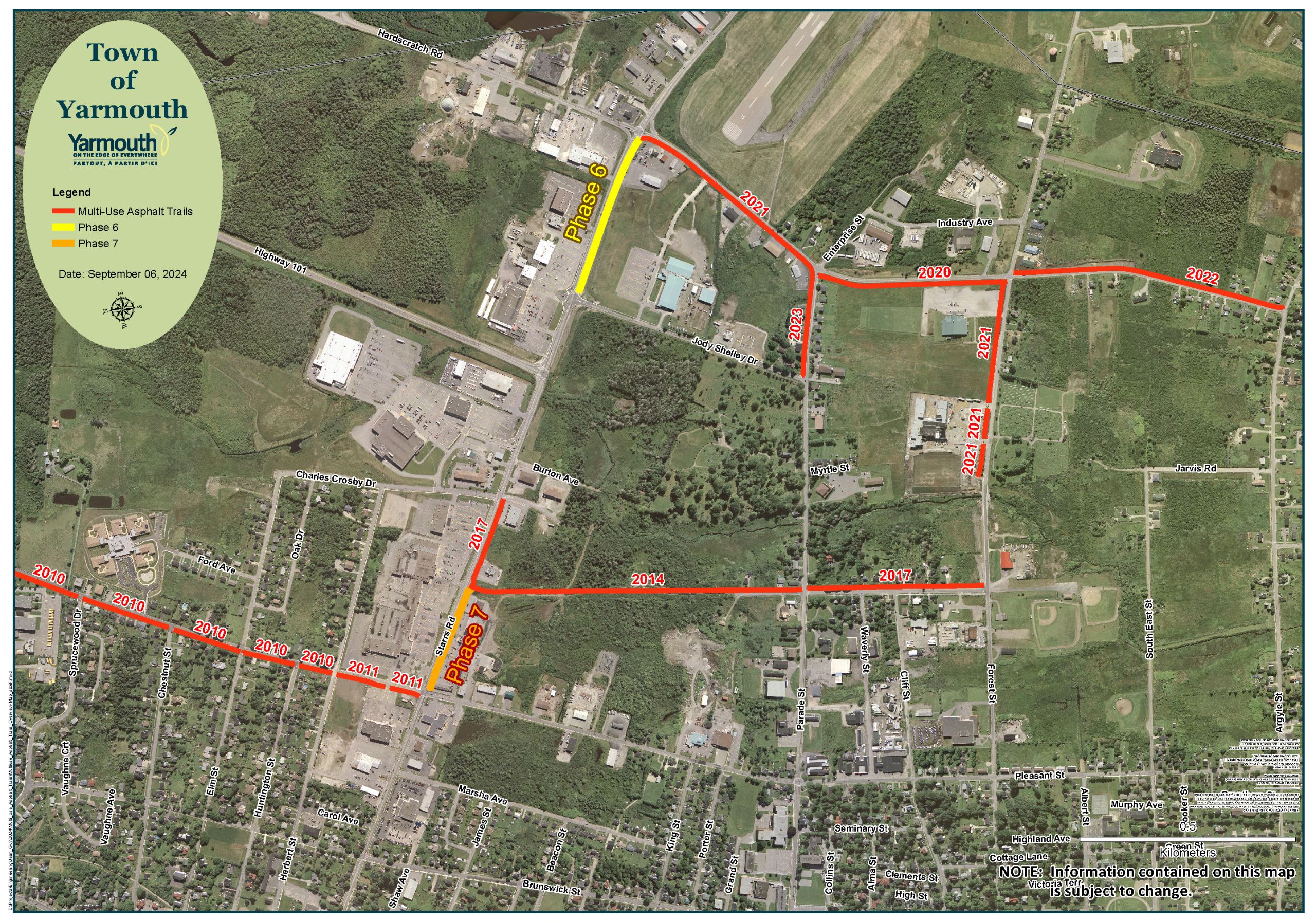The core of the Town of Yarmouth is identified by the four corners of Haley Road/Starrs Road, Starrs Road/Main Street, Main Street/Argyle Street and Argyle Street/Haley Road in the South East corner of the Town of Yarmouth (please see the map called "Sidewalks & Multi-use Trails July 2021.pdf" in the documents section to the right). The aim of this project is to further connect these corners and provide accessible trails for pedestrians and cyclists that make it easier to move around in Yarmouth's downtown core.
