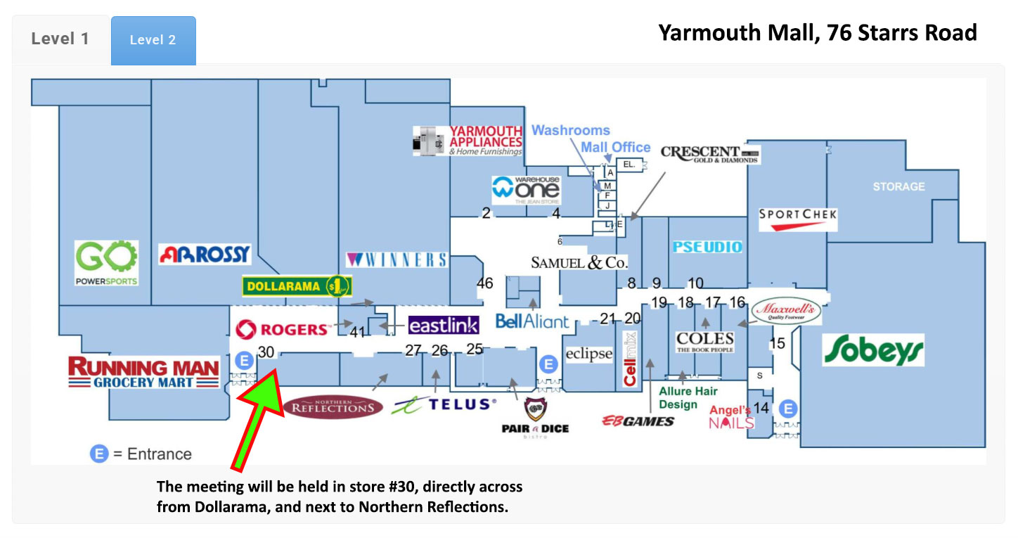 The information session will be held on Thursday, June 26th, 6:30 pm to 8 pm, at the Yarmouth Mall, 76 Starrs Road. The meeting will be held in store #30, directly across from Dollarama, and next to Northern Reflections – see the map below. Use the entrance next to Running Man Grocery Mart. Signs will be in place.